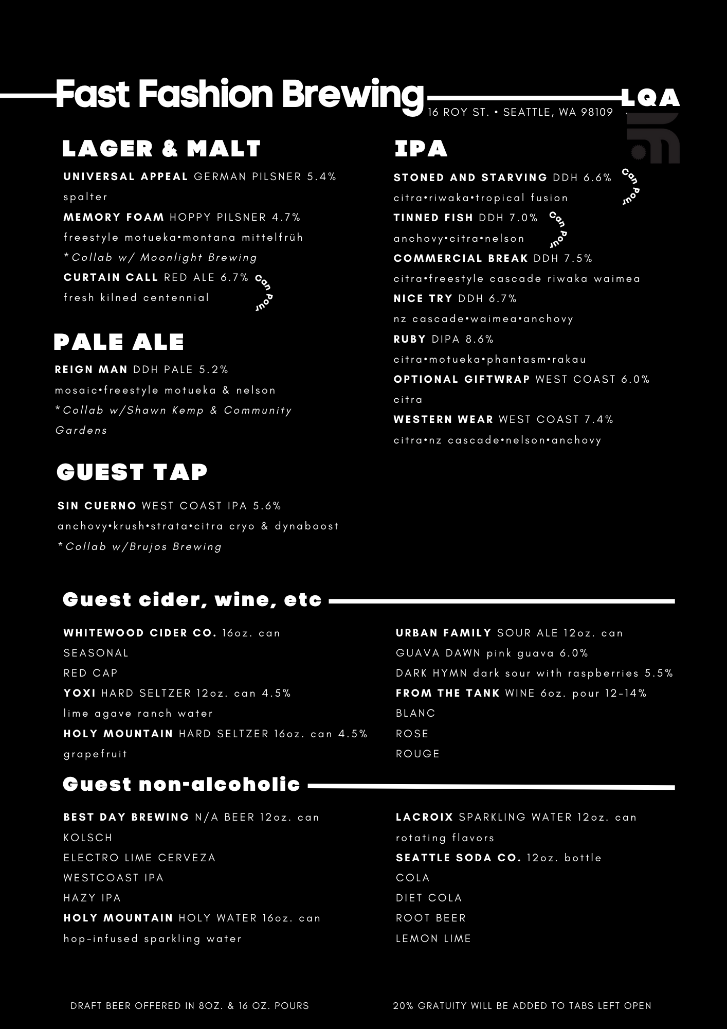 Fast Fashion LQA features a rotating menu of Fast Fashion Beers, guest beverages, non-alcoholic options, and snacks. We’re located close to Climate Pledge Arena and hours may vary to accommodate arena events.